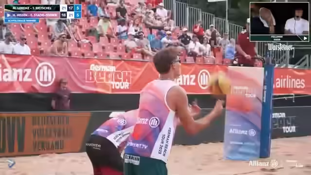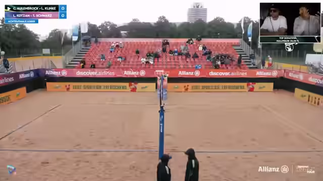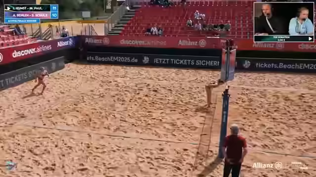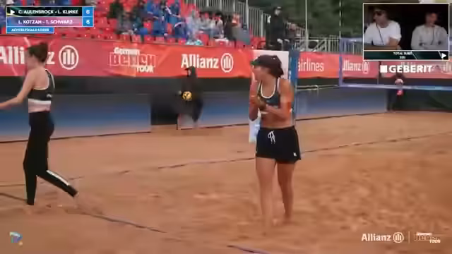06:47:14Die erste Partie der Allianz German Beach Tour in München stand im Zeichen des Duells zwischen Titelverteidigerinnen Borger/Schieder und Behlen/Schulz. Schiedsrichter und Kommentator analysierten eine durchwachsene Leistung des favorisierten Duos, deren Side-Out-Quote schwach war. Während Behlen und Schulz konstant Druck aufbauten, insbesondere durch starken Abwehrarbeit von Anna Behlen, wirkten Borger und Schieder nervös und fanden ins Spiel nur schwer hinein. Besonders Mary Schieder wurde kritisiert für ihre geringe Präsenz am Netz und unglückliche Ballberührungen.