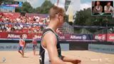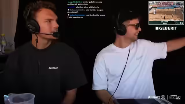 04:08:23Das Spiel von Grüne/Ittlinger geht als historisch in die Annalen der German Beach Tour ein. Mit nur 14 insgesamt kassierten Punkten über zwei Sätze ist es das eindeutigste Ergebnis. Nach dem Match kommt es zu einer kleinen Verwirrung, als Streamer und Chat versuchen, einen unerkannten Spieler aus der Volleyball-Bundesliga zu identifizieren. Dabei verlieren sie sich in falschen Namen und Vereinen, was für leichte Unterhaltung sorgt.