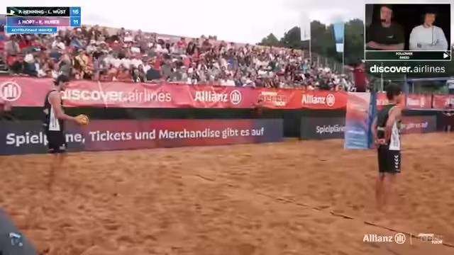 08:55:43Der Fokus wechselt nun zum Herrenturnier. Die Kommentatoren stellen die ersten beiden Achtelfinal-Paare vor. Favoriten sind das angesetzte Duo Paul Henning/Louis Wüst, während Kim Huber/Janis Hopp in der Außenseiterrolle starten. Es werden die Stärken der Spieler analysiert: Huber und Hopp sind ein starkes Abwehrduo, während Henning/Wüst international punktetechnisch führend sind. Das Spiel beginnt und beide Teams zeigen eine gute Annahme.