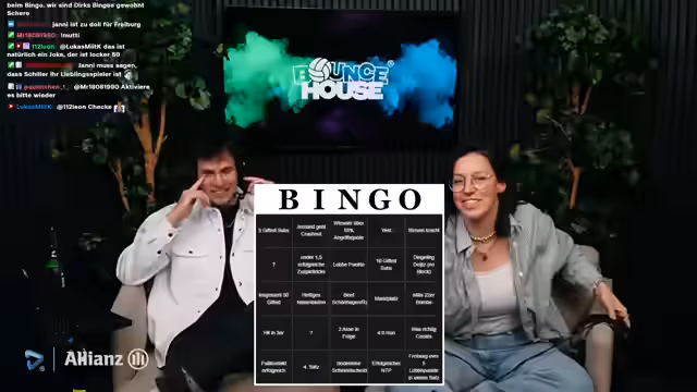 00:20:54Ein zentrales Element des Streams ist ein interaktives Bingo-Spiel. Die Zuschauer können durch bestimmte Ereignisse im Chat oder im Spiel Bingo-Felder markieren lassen. Dazu gehören zahlenbasierte Kriterien wie '50 Giftet' oder 'Unter 1,5 erfolgreiche Zuspieltricks', aber auch spielerische und emotionale Events wie 'Janni heult', 'Beef zwischen Spielern' oder 'Janni sagt einen Spieler mag sie doll'. Dieses Bingo dient als interaktives Wettbewerbselement und bindet die Community aktiv in den Stream ein.