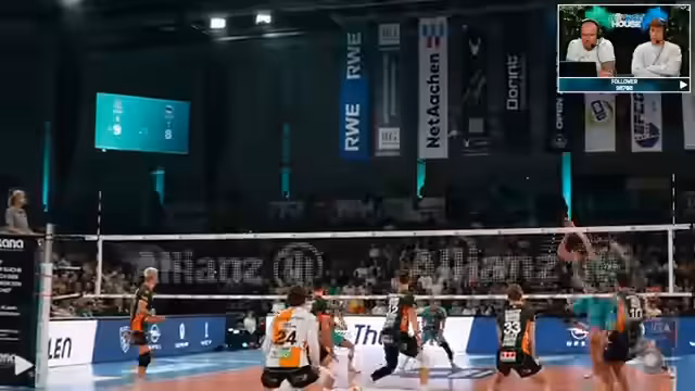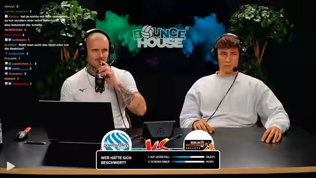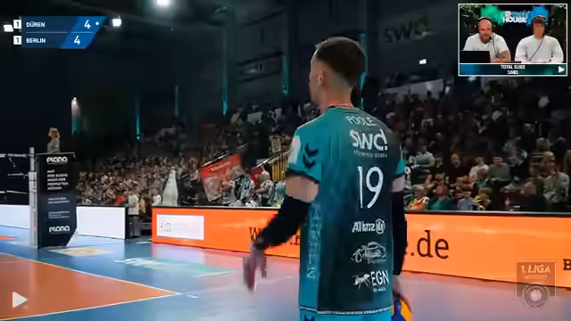 02:46:45Zu Beginn des Livestreams wird das Duell zwischen Düren und Berlin als Topspiel der Volleyball-Bundesliga eingeleitet. Der Kommentator beobachtet die beiden unterschiedlichen Perspektiven: Schnippo, der den Job als Kommentator macht, und Janik Schiller, der eher als Fan mit Popcorn das Spiel verfolgt. Es wird kurz die Ausgangslage der Mannschaften skizziert und die erste Aufstellung erwähnt.