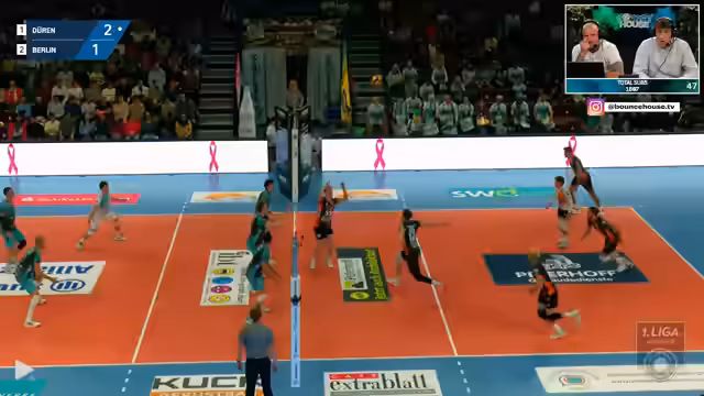 01:44:25Das Spiel beginnt mit der Aufstellung von Düren, die mit einem Durchschnittsalter von 47 Jahren antritt. Kommentatoren diskutieren die lang anhaltende Debatte um einen Ball im Netz und die hohe Fehlerquote von Berliner Jake Haynes. Nachdem Haynes ausgewechselt wurde, stabilisiert sich die Annahme Berlins, während Düren den ersten Satz klar gewinnt. Der entscheidende Faktor war die starke Aufschlagsleistung von Düren, die Berlin ins Schwäche manövrierte.