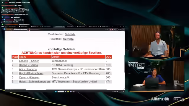01:45:23Ein zentraler Teil der Sendung ist der Ausblick auf das bevorstehende GBT-Turnier in München. Die aktuelle Setzliste für die Männer zeigt ein starkes Feld mit namhaften Teams wie Kubowatz und Thilo & Momme. Besonders wird das Team Köber & Stadi als Außenseiter gehandhabt, das aber das Potential hat, durch die Quali zu kommen. Bei den Frauen ist das Hauptfeld ebenfalls sehr stark zusammengestellt, mit Teams wie Paula & Maret und Borga & Schieder, die für Spannung sorgen könnten. Fantasy wird zu einem späteren Zeitpunkt behandelt.