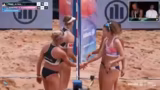02:28:08Mary und Carla kämpfen sich vom 4-8 Rückstand zurück auf 12-10. Die Auszeit scheint die richtige Entscheidung gewesen zu sein, da das Team danach viel ruhiger und geordneter agiert. Carla hält wichtige Bälle und bringt Durchschlag ins Spiel. Julia Dysonberger hat weiterhin Probleme, besonders mit dem Side-Out. Mary zeigt ebenfalls eine bessere Annahmeleistung.
