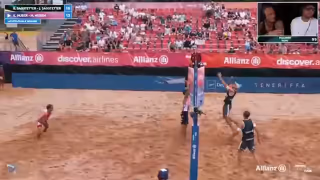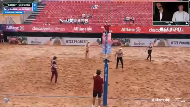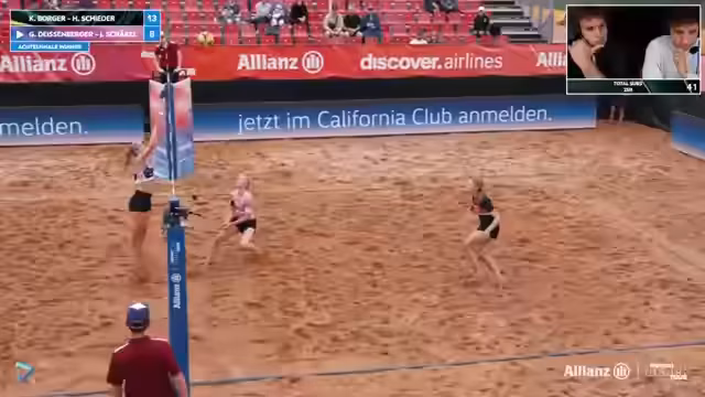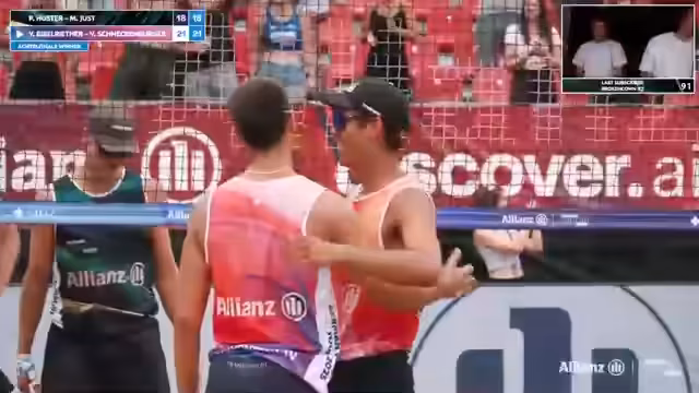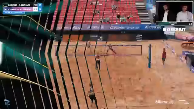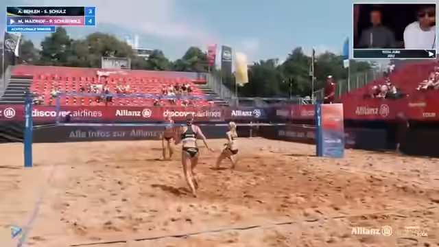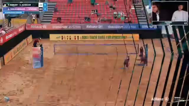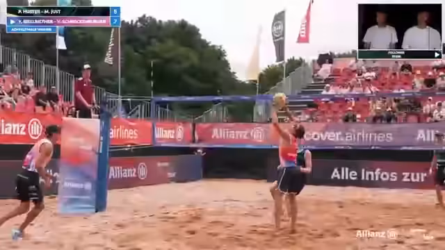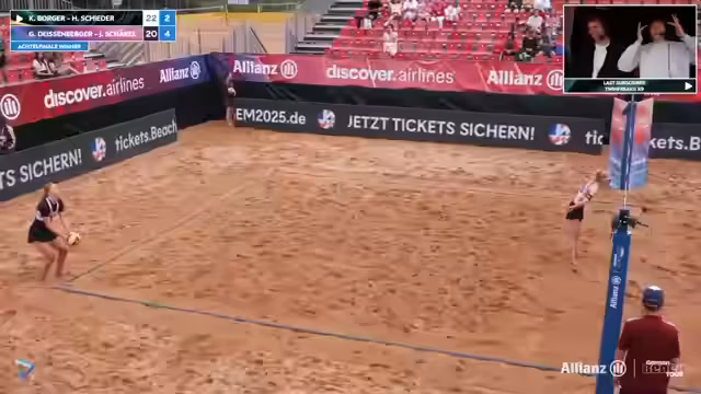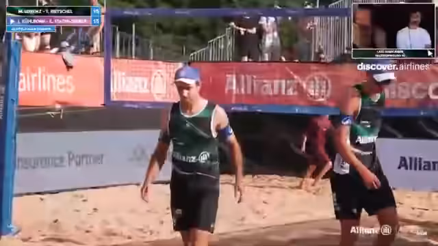 09:02:02Das Spiel zwischen Lorenz/Ritschel und Kühlborn/Stadiseber nimmt Fahrt auf und wird zunehmend spannend. Beide Teams zeigen starke Leistung und kämpfen jeden Ball. Es kommt zu mehreren Herausforderungen, bei denen auch das Verhalten der Spieler analysiert wird. Insbesondere wird die Mimik und Körpersprache von Jannik Kühlborn genau beobachtet. Die Atmosphäre im Stadion ist bei Temperaturen über 30 Grad sehr aufgeregt und unterstützt die Spieler massiv.