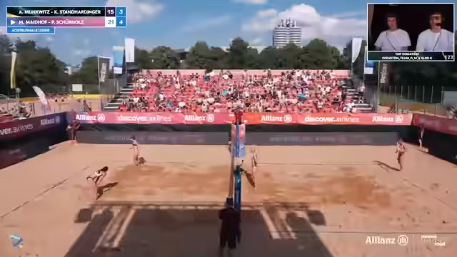 10:08:38Ein packendes Beach-Volleyball-Duell entfaltet sich zwischen den Teams Kubowatz und Reisig-Seiser auf der ALLIANZ German Beach Tour in München. Besonders Luis Kubo überzeugt mit starken Abwehrleistungen und vielen direkten Angriffen. David Ponywatz zeigt ebenfalls konstante Leistungen, während Matthias Seiser mit soliden Blocks und Laurens Reisig mit zunehmend besseren Aufschlägen überzeugen. Das Spiel bleibt bis zum Ende spannend und geht in einen Tie-Break, der die Spannung weiter steigert.
