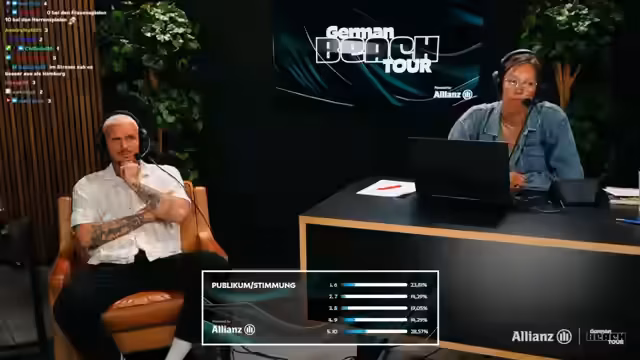 00:18:14Nach persönlichen Einschätzungen zur eigenen Verfassung und Arbeitsbelastung wenden sich die Moderatoren einer Bewertung der Veranstaltung in Bremen zu. Bei der Bewertung der Location erhalten die Kommentatoren und der Chat eine mittlere Note von 8,5, wobei der Blick auf den Fluss und die Side-Courts gelobt wird, während das Sponsorendorf und die Logistik kritisiert werden. Das Publikum erhält eine Note von 7, da die Stimmung besonders im Finale weniger ausgelassen als erwartet war, und die Moderation der Live-Übertragung wird thematisiert, wobei ein Plädoyer für mehr Teamgeist statt Gegenüberstellung abgegeben wird.