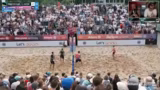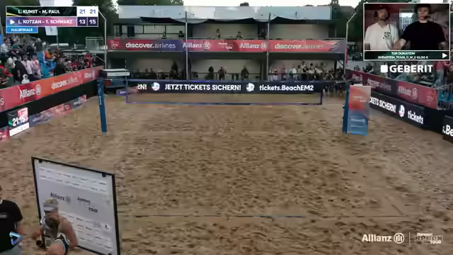 07:34:18Im zweiten Satz stellt sich ein starkes Ungleichgewicht ein. Fretschner/Winter agieren dominant und nutzen den Service, um schnell eine 9-2-Führung zu erreichen. Die Kommentatoren bemerken, dass die Aufschlagqualität im ersten Satz nicht gehalten werden kann, und das Spiel verliert an Tempo. Fretschner und Winter bleiben konsequent in ihrem Spiel und sichern sich mit einem klaren 21-15 im zweiten Satz den Sieg, indem sie den Titel bei der German Beach Tour in Hamburg holen.