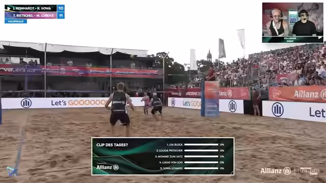 07:29:54Das Spiel erfährt eine dramatische Wendung, als Robin Sova eine beeindruckende Serie von fünf Aufschlagpunkten in Folge hinlegt. Dies führt dazu, dass er und Jonas Reinhardt den Satz in letzter Sekunde mit 21-19 für sich entscheiden. Die Kommentatoren sind von der Performance begeistert, und der Fokus wechselt zum Fantasy-Turnier. Der aktuelle Stand der Fantasy-Captains wird aktualisiert, wobei die erfolgreichen Picks gelobt und die verpassten Chancen wie der Aufschlagfehler analysiert werden.