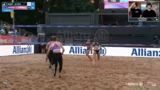 02:31:05Nach einer technischen Pause startet das erste Halbfinale des Tages zwischen Lukas Fretschner/Sven Winter und Jonas Kaminski/Luis Kubo. Die Moderation stellt die Teams vor und hebt besonders den athletischen Stil von Lukas Fretschner hervor. Das Spiel verläuft hochspannend, mit vielen spektakulären Rettungsaktionen von Sven Winter und einem klaren 2:0-Sieg für Fretschner/Winter. In den Pausen und Satzpausen werden Interviews mit den Spielern wie Lukas Fretschner gezeigt, der sich selbst als 'Edelhelfer' und Sven Winter als 'Bank' im Team beschreibt, und die besondere Dynamik ihres Spiels wird analysiert. Sven Winter reagiert nach einer umstrittenen Schiedsrichterentscheidung verärgert auf das Spielfeld.