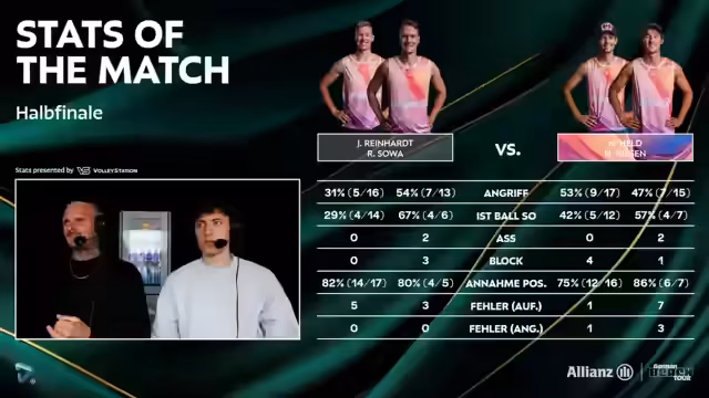 03:22:00Hannes Nissen gelingt es, die Situation zu stabilisieren, und das Team von Held/Nissen gewinnt wichtige Punkte zurück. Die Taktik, den Ball gezielt in die freie Feldhälfte zu spielen, führt zum Punktegewinn. Doch Robin Sova kontert mit einem extrem schnellen Aufschlag, der stark an die Routine von Jonas Kaminski erinnert. Nach einem knappen Ballwechsel gewinnt Held/Nissen den zweiten Satz mit 17:12 und sichert sich den Finaleinzug. Die Storyline des favorisierten Duells gegen die Ponys bleibt somit bestehen.