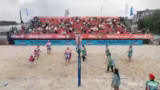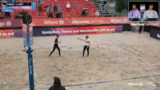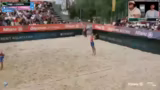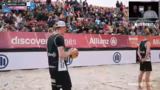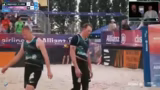 02:16:37Nach der dramatischen Wende im ersten Satz setzen Barber/Gernat ihre dominanten Leistung fort und sichern sich den Satzgewinn. Beutel/Klinke haben sichtlich Mühe, den Rückstand wettzumachen, und kämpfen um jeden Punkt. Die Kommentatoren bewundern die kämpferische Leistung des Underdog-Teams, insbesondere Leo Klinke, die fast perfekt agierte. Letztendlich können Barber/Gernat den zweiten Satz klar für sich entscheiden und sich den Finaleinzug sichern.