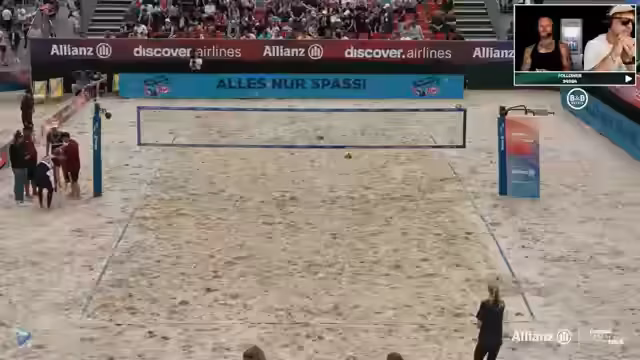 03:18:45Der Livestream beginnt mit einer technischen Auszeit am Finalsonntag, die wegen des knappen Spielverlaufs entschieden wurde. Ein beeindruckender statistischer Fakt wird genannt: Hennes Nissen hat sieben Aufschlagfehler in Serie begangen und stand damit kurz vor dem Verlassen des Feldes. Das bisherige Spiel ist von vielen Aufschlagfehlern geprägt, was die hohe Dramatik erklärt. Ein besonderes Highlight war eine spontane, choreografierte Tanzperformance im Stadion, die von den Spielern vorgemacht und vom Publikum mit Begeisterung nachgeahmt wurde.