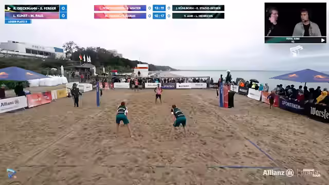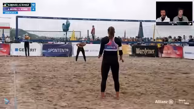 00:10:43Das erste Spiel des Tages auf Court 1 beginnt zwischen Behlen-Schulz und Behle/Elea. Die Kommentatoren beobachten, dass Anna Behlen und Sarah Schulz zu einem souveränen Start in den ersten Satz finden. Sie loben Annas starke Defense und ihr erfolgreiches Herausarbeiten von Bällen, auch wenn die beiden Teams bei der Annahme und Blockbildung anfangs noch Probleme haben. Die Stimmung wird als intensiv beschrieben, besonders mit Blick auf das Gefecht um jeden Punkt.