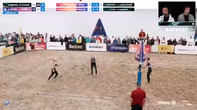 01:20:39Der Kommentator spricht mit den Spielerinnen über die besondere Atmosphäre in Timmendorf, insbesondere die mit Pyrotechnik verbundenen lauten Detonationen. Sarah Schulz gibt an, dass die lauten Geräusche von den anderen Feldern störend sind, aber sie sich darauf konzentrieren kann. Der Kommentator stellt fest, dass es für die Athleten zur Normalität gehört und man sich darauf fokussieren muss. Die Stimmung auf dem Feld wird als sehr intensiv beschrieben, die von den Spielern als Belastung und gleichzeitig als positiver Teil des Turniererlebnisses empfunden wird.