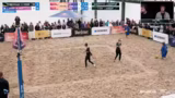 00:53:59Der dritte Satz gestaltet sich als absoluter Herzschlag. Beutel-Klinke liegen zunächst zurück, kämpfen sich aber wieder heran. Bei 19:19 kommt es zu einem entscheidenden Punkt, der über den Sieg des Spiels gehen könnte. Die Spannung steigt, als Elea Beutel einen Ball am Netz spielt und diesen nicht für sich entscheiden kann. Behlen-Schulz nutzen diese Chance und gehen mit 20:19 in Führung. Es folgen weitere dramatische Punkte und Matchbälle, ehe Sarah Schulz mit einem gespielten Ball ins Aus den Satz und somit das gesamte Match verliert. Das Spiel endet denkbar knapp und emotional.