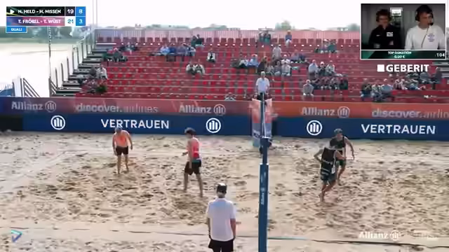 00:38:55Die Kommentatoren besprechen eine besonders hektische und kontrovers entschiedene Spielszene, bei der eine Challenge des Teams von Peter Wolf geführt wird. Die Schiedsrichterentscheidung wird als korrekt bewertet, aber als für die Spieler frustrierend empfunden. Neben dem sportlichen Geschehen wird auch das Publikumserlebnis hervorgehoben, wie der „Pöttewatch“ und die Feierlaune der Zuschauer am Rande des Courts. Der positive Aspekt der Ballverkäufe wird ebenfalls erwähnt, was die Nähe zum Publikum unterstreicht.