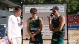 04:59:12Nach dem klaren Sieg von Tristan und Tammo werden die Kommentatoren mit den Gewinnern interviewt. Die Sieger äußern ihre Freude über die Qualifikation für das Hauptfeld und den damit verbundenen Nulldruck für die nächsten Spiele. Sie betonen, dass sie sich auf die German Beach Tour konzentrieren werden und ihr Ziel darin besteht, so viele Turniere wie möglich zu gewinnen. Das Turnier wird als wichtiger Lern- und Erfahrungsschritt für die internationale Szene gesehen.