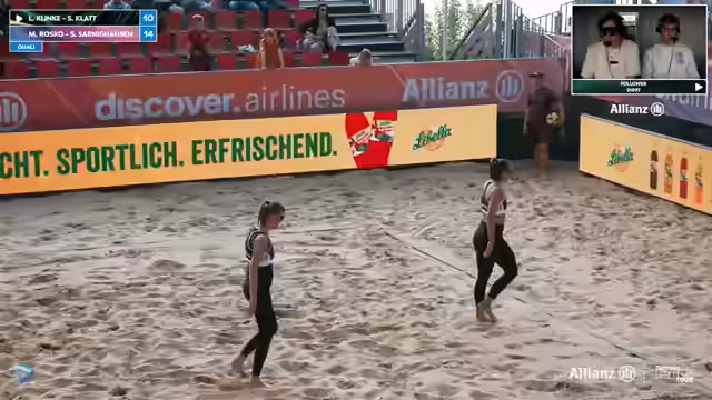 02:28:52Das Duell zwischen Maya/Sophie und Stephanie/Leo ist im Gange. Das favorisierte Team Maya/Sophie kann schnell einen substantialen Vorsprung aufbauen und führt mit 14-10. Die Gegnerinnen Stephanie und Leo kämpfen sich jedoch Punkt für Punkt zurück und verkürzen den Rückstand auf 14-12. Kommentatoren loben die Moral der Underdogs, während die Favoritinnen nun unter Druck geraten. Ein knapper Ball wird zum Thema, dessen Auswertung noch aussteht.