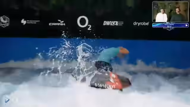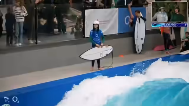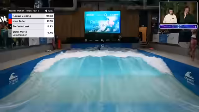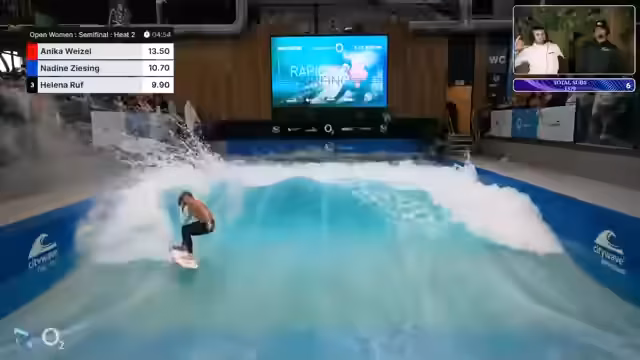 02:29:33Nach dem Damenfinale übernimmt Valeska das Kommentieren für die ersten Heats der Herren Open. Ihr, eine der größten Figuren des deutschen Rapidsurf, wird begrüßt und gibt Einblicke in die Szene, wobei sie erklärt, warum einige Top-Surferinnen wie Maya Sauer oder Jojo Druskal nicht teilnehmen. Parallel startet das erste Viertelfinale der Herren mit einer starken Leistung von Antonin Meyer.