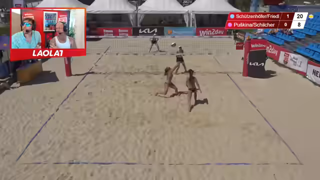 08:17:00Der Spielstand ist 4-3 für Österreich. Die Kommentatoren wechseln die Seiten und erläutern, wie der Score angezeigt wird. Österreich führt mit 14 zu 11 und wechselt die Taktik auf die Außenseite. Ein Angriff ist knapp. Die Diskussion um die Teamzusammenarbeit zwischen Schützenhöfer und Friedl wird fortgesetzt, die auch als pensionierte Beachvolleyballerinnen bezeichnet werden.