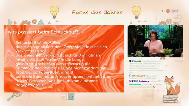 00:21:56Es wird nach Trinkbrillen gefragt und erklärt, dass diese als Backup für die Verlosung gedacht waren, aber ein anderes Produkt ausgewählt wurde. Die Möglichkeit, Gangarmbänder zu verlosen, wird in Erwägung gezogen, falls das Interesse besteht. Es wird angekündigt, dass es wieder eine "Fuchs des Jahres"-Kategorie geben wird, gefolgt von einem Quiz, um das Gelernte zu überprüfen. Eine neue Kategorie und ein Bastelprojekt mit Plastikstrohhalmen werden ebenfalls vorgestellt. Die Streamerin möchte eigentlich nur bis 21 Uhr streamen, um EuroLeague VfB Stuttgart zu schauen, schafft es aber wahrscheinlich nicht. Es gibt noch zwei Ideen für nächste Woche, den Witz der Woche und die Wahl eines Songs für die Playlist. Die Technotaube wurde zu Beginn des Streams gespielt. Die Streamerin sucht jemanden, der ein Fuchs-Intro-Video erstellen kann. Die Kategorie "Fuchs des Jahres" wird in "Gefährliches Halbwissen" umbenannt, und es wird über die Entstehung von Schluckauf gesprochen, wobei Zwerchfell und Stimmbänder eine wichtige Rolle spielen. Ein Kahoot-Quiz zum Thema Schluckauf wird durchgeführt.