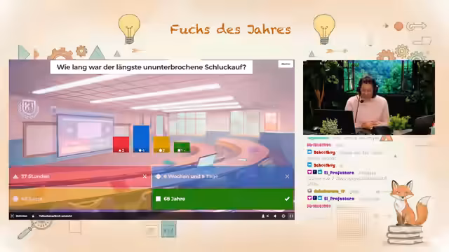 00:23:54Nachdem die Verlosung eines Gang-Armbands aufgrund des Desinteresses der Community zunächst gestrichen wurde, entscheidet sich die Streamerin dafür, dies dennoch zu tun. Anschließend wird das Bildungssegment 'Fuchs des Jahres' eingeleitet. Es geht um das Thema 'Schluckauf', bei dem Janni die Anatomie des Zwerchfells und der Stimmbänder erklärt und den Reflexvorgang des Schluckaufs bildlich darlegt. Diesen Teil schließt sie mit einem interaktiven Kahoot-Quiz ab, bei dem die Zuschauer ihr Wissen testen können.