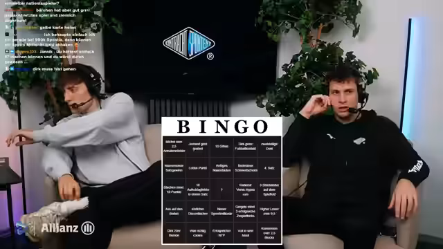 00:17:00Die Streamer analysieren die anstehenden Gegner. Förde wird als erfahrene, aber nicht zu unterschätzende Rentnertruppe beschrieben, der im Hinspiel schon wehgetan hat. Bounce House gegen Warnemünde wird als spannendes Duell eingestuft, da Warnemünde in Form zu sein scheint. Ein zentraler Element des Streams ist das Bingo. Nach kurzer Überlegung wird die mittlere Reihe des Bingos als wahrscheinlich identifiziert. Eine besondere Challenge für Dirk wird angekündigt, deren Lösung für das Bingo entscheidend ist.