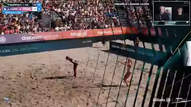 09:08:10Das Duell der Top-Teams geht in eine intensive Phase. Sandra Hedlinger zeigt erneut ihre Klasse im Netz, indem sie wiederholt den Netzroller der Gegnerin entschärft. Gleichzeitig kämpft Anna Grüne mit der Annahme, deren Quote unterirdisch ist und den Sieg gefährdet. In einem dramatischen Ballwechsel scheitert die gegnerische Seite am Netz am Abstand, was einen knappen Punkt für Grüne und Hedlinger bedeutet.