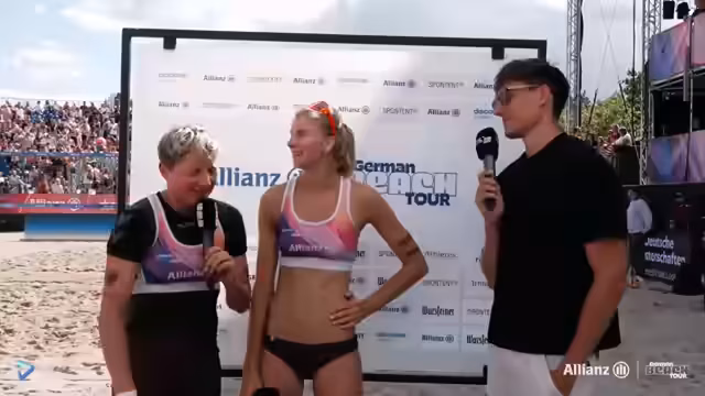 08:18:50Tillmann und Müller gewinnen den zweiten und dritten Satz klar und stehen damit im Finale. Die Kommentatoren würdigen die Leistung von Barber und Gernhardt und loben deren Kampfgeist. Im Anschluss folgt ein Post-Game-Interview mit den Siegerinnen. Sinja Tillmann und Svenja Müller betonen ihre Freude über den Finaleinzug und die besondere Atmosphäre bei der Meisterschaft.