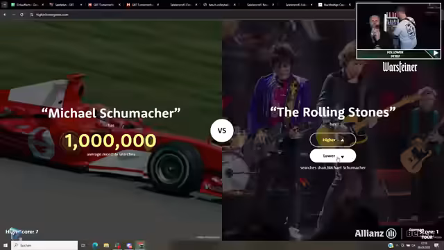 02:15:14Nach dem Interview wird eine spontane Wette initiiert, bei der die Streamer und das Chat-Publikum um Spontys um die Frage ringen, ob ein bestimmter Begriff – wie 'Rolling Stones' oder 'Pete Sampras' – in den Suchanfragen höher oder niedriger liegt. Nach mehreren Runden und teils knappen Ergebnissen verlieren die Streamer letztendlich die Wette, was zu humorvollen Kommentaren und einem leichten Frust bei Martin führt.