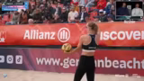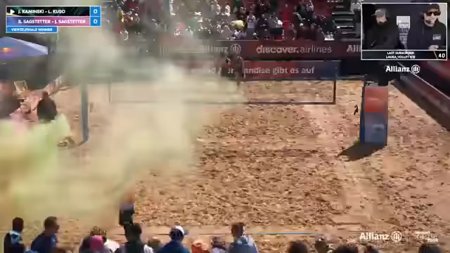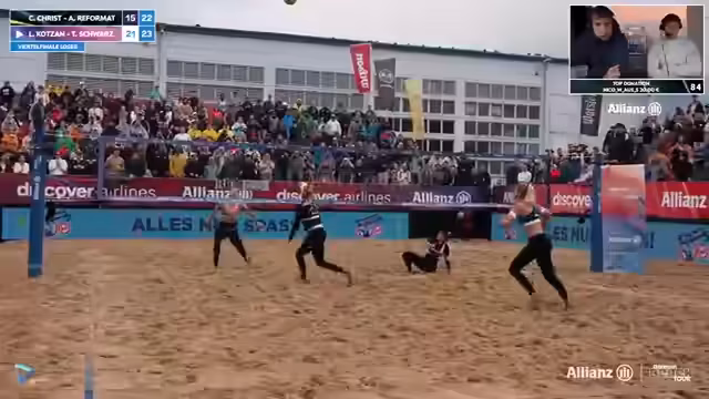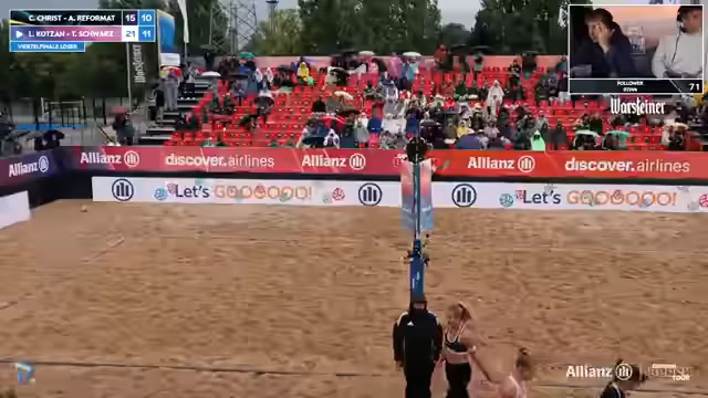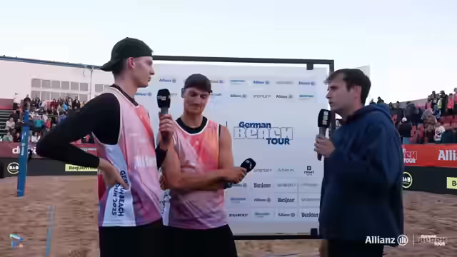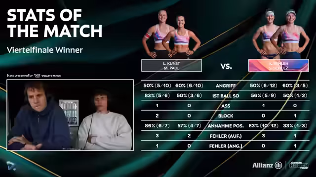 04:30:30Nach dem knappen Sieg von Kunz-Paul im dritten Satz leitet der Streamer die Siegesfeier und das offizielle Interview ein. Die Spielerinnen, erkältungsgefährdet und noch leicht nass, gratuliert man zum Einzug ins Halbfinale. Sie geben an, sich im zweiten Satz nicht ganz fokussiert zu haben und mussten sich erst auf die gute Aufschlag- und Angriffsleistung von Behlen/Schulz einstellen. Sie betonen, wie herausfordernd es ist, mit dem nassen und schweren Ball zu spielen, der sich unberechenbar verhält. Am Ende jubelt man jedoch den Siegerinnen zu.