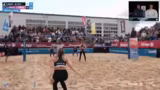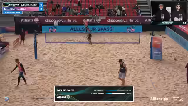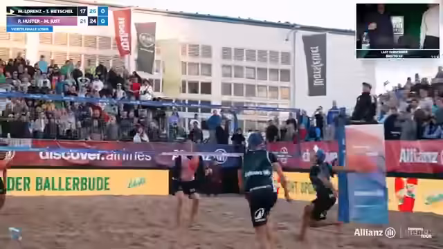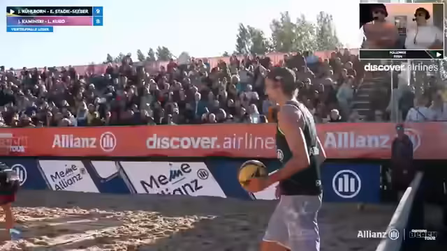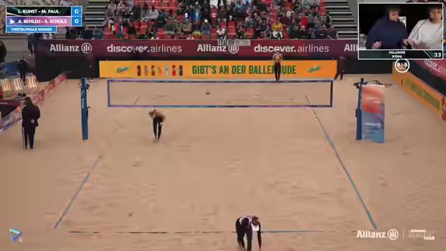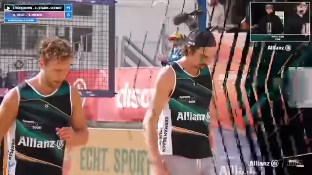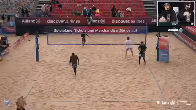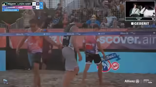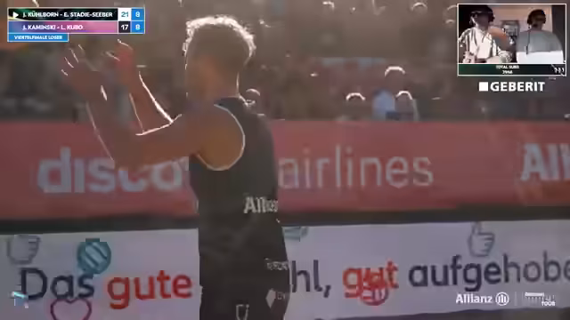 09:41:27Erik Stadi zeigt beeindruckende Abwehrleistungen und ist mit über 60 Prozent im First Ball Side-Out extrem erfolgreich. Gegenüber steht Jannik Kühlborn, der nach einer_phase mit niedriger Quote wieder in den Film zurückfindet und einen absoluten Laserfokus aufweist. Das Spiel ist eine Nervenschlacht, bei der kein Team nachlässt. Beide Paare geben alles, um ihre Chance auf das Halbfinale zu nutzen, und führen das Publikum an die Grenze der Belastbarkeit.