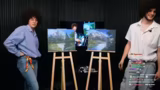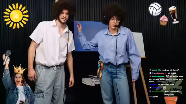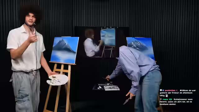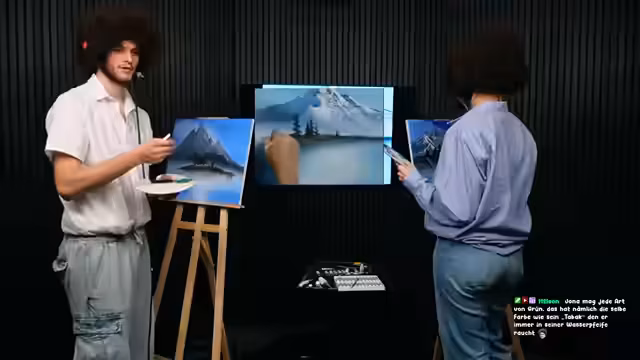 00:08:37Der Stream beginnt mit den Moderatoren Janni und Jona, die ankündigen, ein Bob Ross Tutorial live nachzumalen. Janni hatte die Idee, den Künstler Bob Ross zu thematisieren, nachdem Jona absagte, aber seinen Freund Bob empfohlen hat. Die Moderatoren zeigen passende Outfits und planen, gemeinsam mit dem Publikum eine Leinwand nach dem Vorbild von Bob Ross zu gestalten. Sie weisen auf ihr neues, verbessertes Studio hin und begrüßen die Zuschauer.