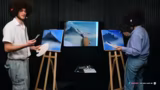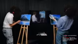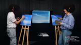 00:24:27Nachdem das ausgewählte Bob Ross Tutorial geladen ist, beginnen die Moderatoren mit dem ersten Schritt: dem Auftragen des Himmels. Janni und Jona bemerken schnell, dass ihre Mischung aus Blau und Weiß zu dunkel ist und passen die Farbanpassung an. Es kommt zu technischen Schwierigkeiten mit der Kamera, die den Bildausschnitt verändert, und die Moderatoren diskutieren über die richtige Pineltechnik und die Notwendigkeit, Pinsel zu reinigen, was ohne Wasser eine Herausforderung darstellt.