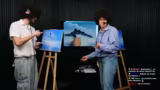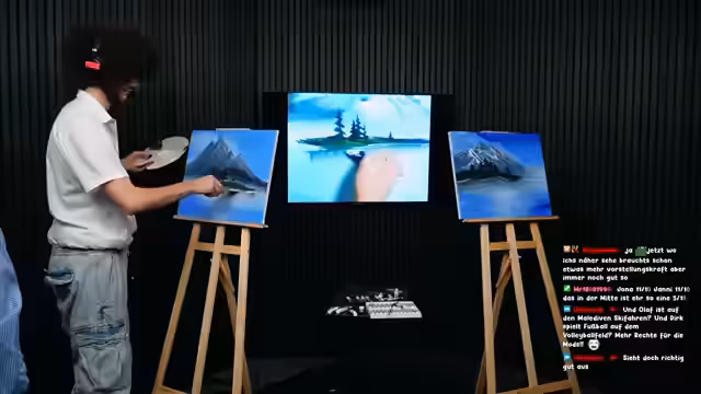 00:37:21Während die Moderatoren versuchen, die Wolken und Berge in der Landschaft zu malen, tauchen immer wieder Probleme auf. Die Farbe verläuft nicht sauber, die Kanten sind unscharf und das Ergebnis wird als 'AliExpress Bob Ross' bezeichnet. Parallel zum Malen unterhalten sich die Streamer über persönliche Themen, wie den kürzlichen Karneval, den Sport, und beantworten Fragen des Chats zu ihrer Ausrüstung und dem Tutorialverlauf.