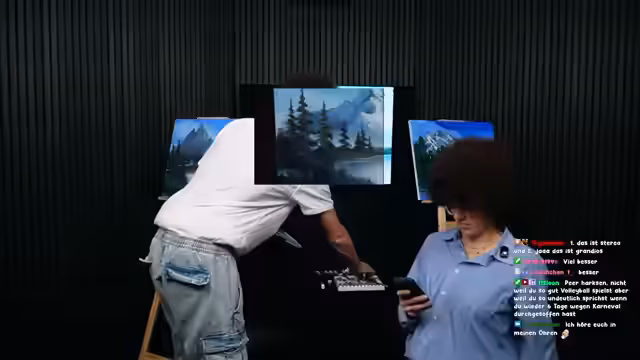 02:08:37Zu Beginn des Streams kämpfen die Streamer mit technischen Problemen, insbesondere mit dem Ton. Der Sound ist失衡, weshalb sie nach Lösungen suchen und den Chat um Feedback bitten. Nach dem Tausch von Mikrofonen und dem Absetzen von Kopfhörern stabilisiert sich die Situation langsam. Währenddessen wird bemerkt, dass die Ölfarben auf der Leinwand bereits sehr dick aufgetragen sind und die Maler über die Mischbarkeit der Farben diskutieren, insbesondere über das Hellerwerden von Grün durch Zugabe von Gelb.