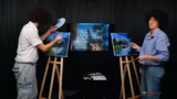 03:00:16Gegen Ende des Streams setzen die Streamer ihre Unterschriften auf die fertigen Bilder. Der eine malt seinen Namen 'Pünsler' in Pink, der andere wählt Braun und malt stattdessen einen Kölner Dom. Sie präsentieren beide Gemälde im Vergleich und loben sich gegenseitig für Details wie die Berge und die Rauchfahne. Als Giveaway-Aktion wird eines der beiden Bilder verlost. Ein Gewinner wird ausgelost, der sich jedoch nicht meldet, weshalb ein zweiter Gewinner gezogen wird.