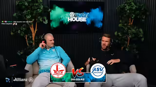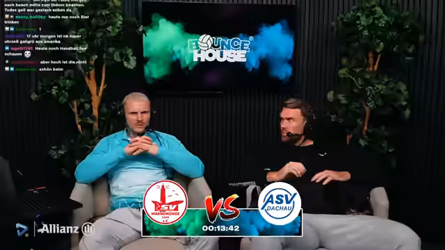 00:07:42Der Stream beginnt im neuen Studio, das noch im Aufbau ist. Es gibt technische Probleme mit der Beleuchtung im Hintergrund, da ein Stecker fehlt, was zu einer dunklen Umgebung führt. Währenddessen wird der bevorstehende Bounce-Pokal-Spiel Warnemünde gegen Dachau angekündigt und die Produktionsfront des Streams wird vorgestellt. Olaf, ein Co-Trainer, ist auf dem Weg zurück und wird für die anstehende Relegation der dritten Herrenmannschaft einsatzbereit sein.