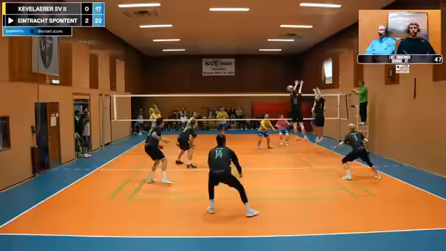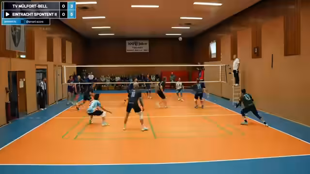 00:27:10Das Spiel beginnt in der lauten, kleinen Halle von Mülfort Bell, die den Heimvorteil der Gastgeber ausnutzt. Die Aufstellung von H2 ist improvisiert, mit dem Skilehrer auf Zuspielerposition. Trotzdem gelingt ein starker Start ins Spiel. Die erste Annahme ist unzureichend, doch der erste Ballzug mit einem Block und einem starken Angriff wird erfolgreich gespielt und das Team nutzt einen frühen Ausgleich, um ins Spiel zu finden.