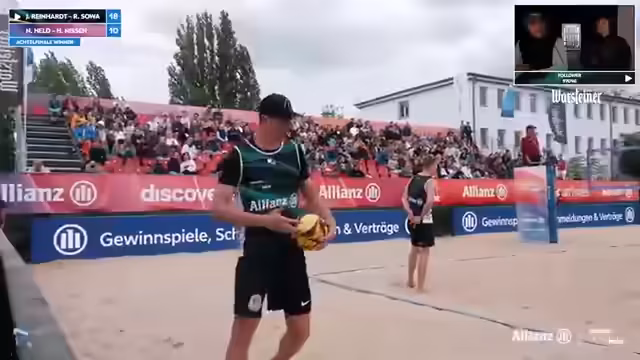 06:03:53Nach einer komfortableren Führung für die Sargis nehmen sie eine Auszeit, um die verbleibenden Punkte sicherzustellen. Jonas und Benni gewinnen ihr Spiel und qualifizieren sich für das Viertelfinale. Die Kommentatoren gratulieren zum Erfolg und unterhalten sich mit den Spielern über ihre Berliner Zeit. Sie erwähnen, dass sie aus Landshut stammen, aber in Berlin wohnen und trainieren. Nach der EM ist der Fokus nun auf der German Beach Tour und sie genießen die Spiele vor heimischem Publikum.