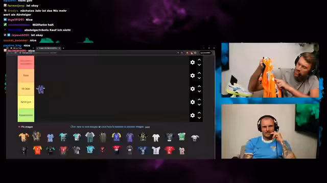 00:38:09Die Moderatoren starten die Bewertung der Bundesliga-Trikots in einer Tierlist-Kategorie (S bis Katastrophe). Erste Vereine wie Dachau (lila Design) und Berlin Volleys (orange Heimtrikot) werden diskutiert, wobei Design, Farbgebung und Partnerlogos kritisch hinterfragt werden. Karlsruhe erhält durchgängig schlechte Bewertungen aufgrund uninspirierter Designs.