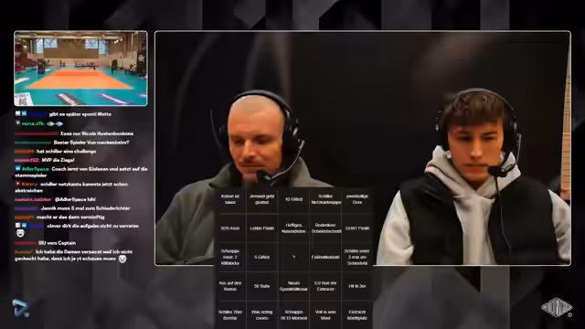 00:19:44Ein zentrales Element des Streams ist das Bingo-Spiel, das zur Unterhaltung und Interaktion dient. Es wird erklärt, dass Yannick Schiller eine Aufgabe von Martin erhalten hat, die erraten werden muss, und Teil des Bingos ist. Klassische Bingo-Felder werden aufgezählt, wie 'Kone sauer', 'Ass auf dem Boden' oder 'Schnippo haut wieder einen Angriffsfehler rein'. Besondere Bedeutung bekommt das Feld 'Schiller mindestens dreimal am Schiri-Stuhl', da dies häufiger vorkommt. Zusätzlich werden Wetten für den Spielbeginn angeboten, z.B. ob der erste Ballwechsel ein Break oder ein Side-Out ist, um die Spannung für die Zuschauer zu erhöhen. Mods werden aufgefordert, aktive Wetten zu moderieren, und der Chat wird aufgefordert, mitzuraten.