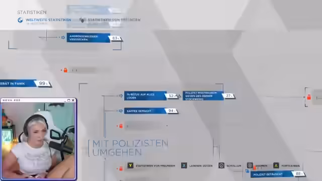 02:09:25Die Streamerin spielt Detroit: Become Human und begleitet die Geschichten von Androiden. Sie interagiert intensiv mit dem Chat während des Spiels und kommentiert die Handlungen der Charaktere. Sie rettet Charaktere wie Cara und Alice vor dem Tod und zeigt emotionalen Einsatz für die Schicksale der virtuellen Figuren. Die Entscheidungen im Spiel führen zu verschiedenen Verläufen und die Streamerin analysiert die Konsequenzen ihrer Handlungen.
