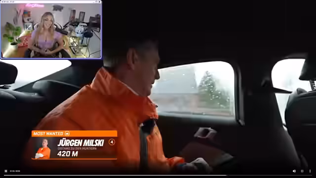 02:32:44Nach dem eigenen Catch schaut die Streamerin weiter der Jagd auf andere Targets zu. Sie verfolgt live, wie René, Nummer 10, von den Jägern gejagt wird. Er versucht, sich mit Hilfe einer Freundin und einer Motorradgang nach Euskirchen abzusetzen, wird aber bei einem Junggesellenabschied entdeckt. Die Jäger sind nah dran, und die Spannung steigt, während sich René nach einem weiteren Fahrer umsieht.