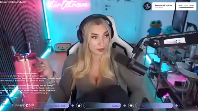 00:20:41Es wird ein Dreh erwähnt, bei dem sie mitgewirkt hat. Sie spricht über ihr Piercing, das nicht neu ist, sondern nur neuen Schmuck hat. Sie erklärt, warum sie es nicht selbst wechseln kann. Auf die Frage nach dem Spiel Spectre Divide antwortet sie, dass es nicht ihr Fall sei, da sie keine Ego-Shooter mag. Die einzige Ausnahme ist Vazon wegen der Skins. Sie erwähnt, dass sie privat Overwatch spielt, obwohl es ein totes Spiel sei, und vergleicht ihre Beziehung zu dem Spiel mit einer gescheiterten Beziehung. Außerdem spielt sie Marvel Rivals und ist dort in Silber 2. Sie erwähnt, dass sie wieder mit Supernatural angefangen hat und einen Teddy für einen guten Zweck gespendet hat.