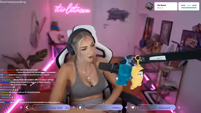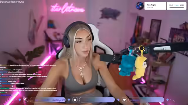 04:08:15Nach einer Pause bereitet sich die Streamerin auf ein weiteres League of Legends-Spiel vor. Sie interagiert mit dem Chat und überlegt, welchen Champion sie bannen soll. Ihre Sorge gilt dem Lip Liner, ohne den sie sich nicht 'slayen' kann. Sie plant, nach dem Spiel noch im 'Just Chatting'-Modus Zuschauer zu farmen, bevor der Stream endet. Ihr Gym-Training erwähnend, bevorzugt sie Krafttraining über Cardio und teilt mit, einen neuen, anstrengenden Trainingsplan mit Fokus auf Beintraining zu haben, um einen 'fetten Arsch' zu bekommen.