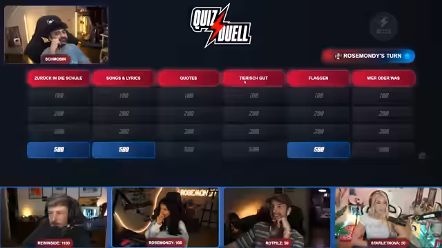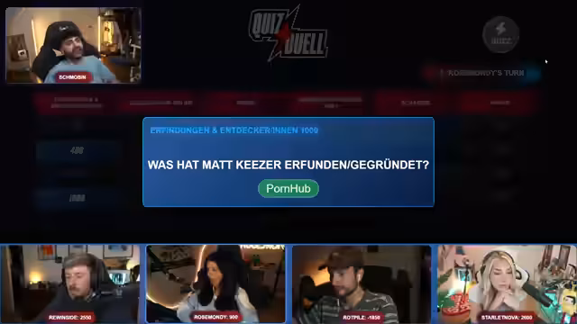 Eine Quizshow wurde mit mehreren Teilnehmern durchgeführt. Die Regeln sahen vor, dass Kategorien mit unterschiedlichem Schwierigkeitsgrad gewählt wurden, was zu einem dynamischen Verlauf führte. Für richtige Antworten wurden Punkte vergeben, bei Fehlern jedoch wieder abgezogen. Die Runden waren durch humorvolle Missverständnisse und einen ständigen Wechsel an der Spitze geprägt.
