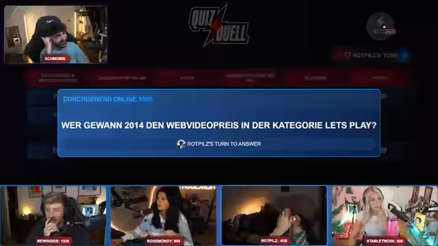 01:30:11Das Quiz gleicht einem emotionalen Achterbahnfahren. Nova kämpft sichtbar mit einer schwierigen Frage und stöhnt über ihre angebliche Blondheit als Erklärung. Eine Frage zur Einführung des Euro sorgt für eine hitzige Debatte zwischen den Teilnehmern über das genaue Datum der Einführung im Jahr 2002. Bei einer Frage zum YouTuber-Format 'Kassel gab es' eskaliert der Wettbewerb, als ein Teilnehmer die falsche Antwort gibt und der Verlierer massiv in die Defensive gedrängt wird, was den Wettbewerb weiter verschärft.