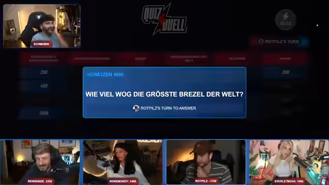 01:28:12Der Stream startet in einem atmosphärischen Chaos. Die Teilnehmer, darunter Felix und Nova, stehen unter massivem Druck, den finanziellen Verlust durch riskante Wetten und das Entfernen von Diamantenblöcken zu kompensieren. Nachdem die Kreatmosphäre geklärt ist, beginnt offiziell die Quizshow mit einer provokanten Frage zur Identität der Person Kyrill aus dem Jahr 2007. Der Orkan Kyrill wird als der Namensgeber identifiziert, was zu einer humorvollen Diskussion über Spitznamen und Politiker führt und den Grundstein für den witzigen, unbeschwerten Ton der Veranstaltung legt.